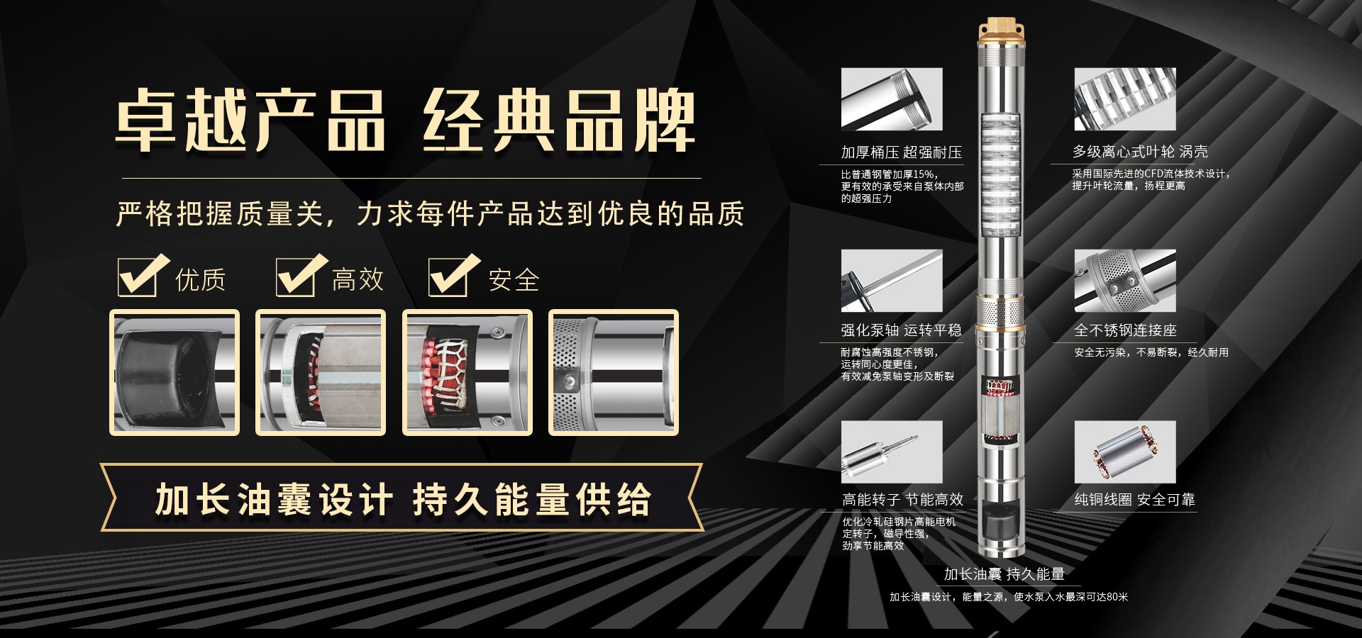 不僅僅是泵,更是流動(dòng)的科技。十多年來(lái),本公司堅(jiān)持走:以質(zhì)量求生存以科技創(chuàng)新求發(fā)展,重合同守信用的道路,生產(chǎn)經(jīng)營(yíng)得到迅速發(fā)展。更希望以后不管從發(fā)達(dá)城市到新農(nóng)村,從工業(yè)制造到尖端科技產(chǎn)業(yè)都隨處可見(jiàn)創(chuàng)江井泵的身影,創(chuàng)江深井泵已成為干萬(wàn)用戶心目中優(yōu)質(zhì)和信心的保證我們將以優(yōu)質(zhì)的產(chǎn)品和最完善的售后服務(wù)來(lái)真誠(chéng)與各界朋友開(kāi)展廣泛的合作,共同創(chuàng)造一個(gè)美好的未來(lái)!